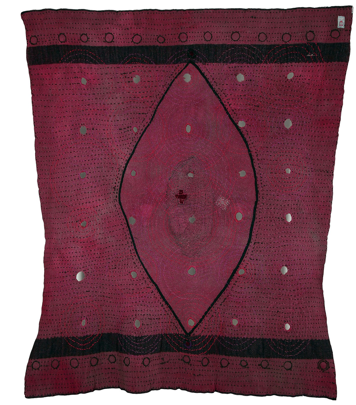 I started it after a medical appointment that made me realize I was aging. I came home from that appointment and cut holes into an old blanket. The initial emotion that started this piece was FEAR.